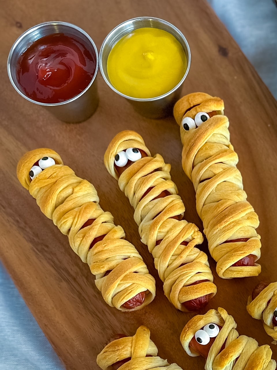 It’s my favorite season, and that means cooler weather, cozy sweaters and hoodies, football, beautiful leaves, pumpkins, hot chocolate, bonfires, and all the best fall flavors! With Halloween coming up this month, you will want to make something quick and easy with the kids, so why not start with these fun crescent dough mummy hot dogs! All you need are hot dogs and crescent roll dough from the refrigerated section of the grocery store. I like to add some candy eyes for added cuteness, and serve our favorite dipping sauces on the side. It’s a fun way to start the seasons celebration!